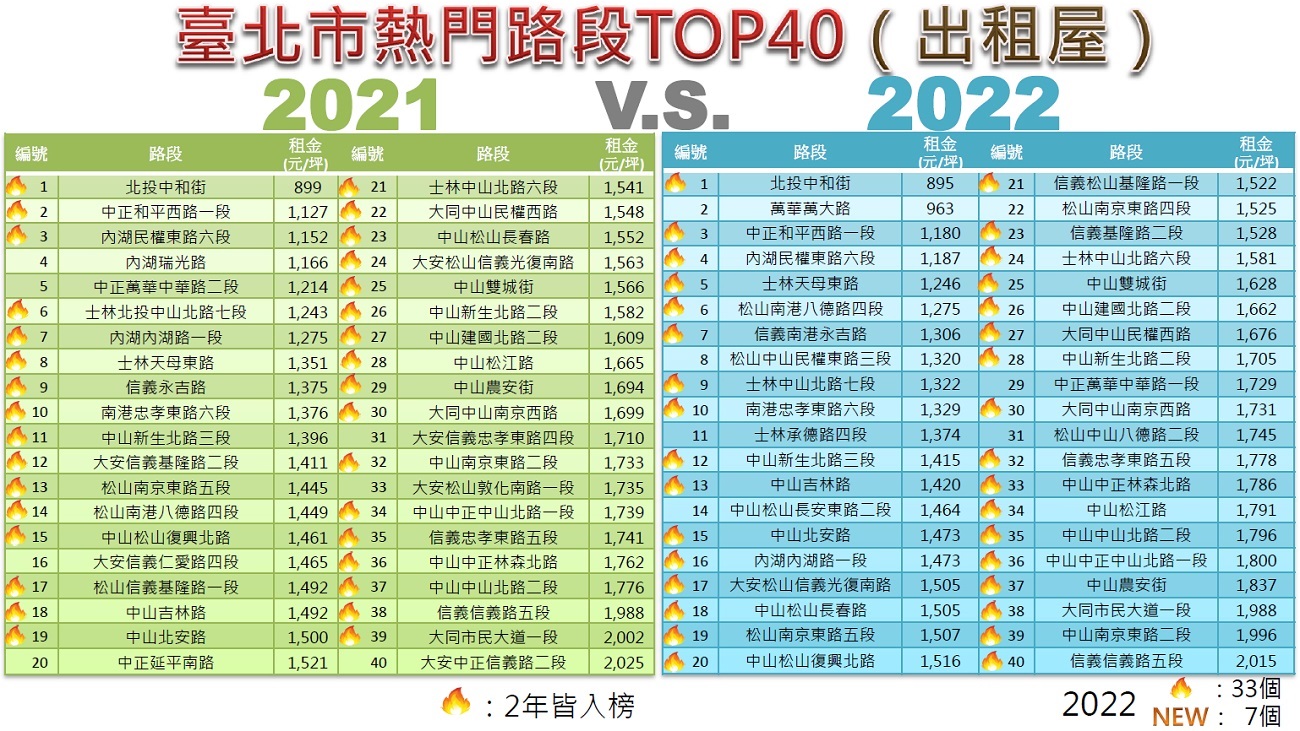 圖7:臺北市熱門路段TOP40「2021v.s.2022」比較表屋─出租屋