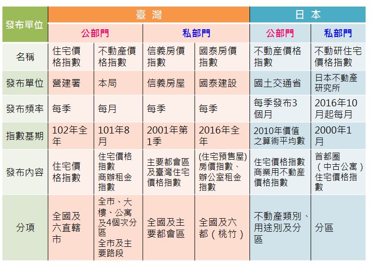 (一)公部門:目前日本公部門國土交通省每季發布不動産價格指數,以2010年價值之算術平均數為基期(指數=100),主要分為三大部分:住宅不動産價格指數、商業用不動産價格指數、不動産交易件數、面積之統計資訊。