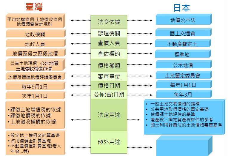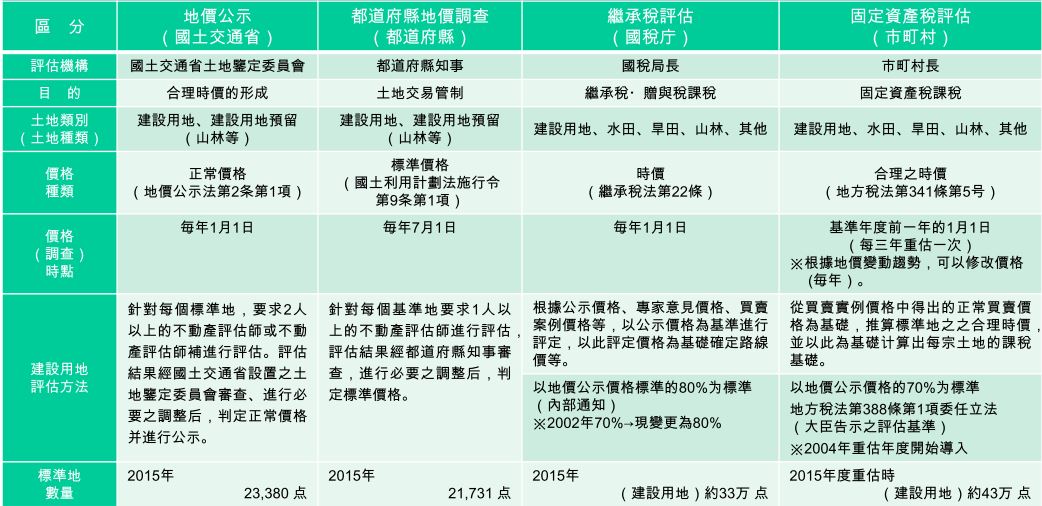 我國公部門地價往往基於不同目的採用不同之估價方法查估而得,故會有同一筆土地上有多種地價且價格有差異情形,而日本公部門地價由中央布設地價控制點,都道府縣進行補充,最後為因應不同課稅目的,各級政府機關再委託不動產鑒定士以公示地價為基礎,佐以買賣實例價格採路線價評價法等進行價額評定,茲將日本公部門地價辦理情形分述如下: