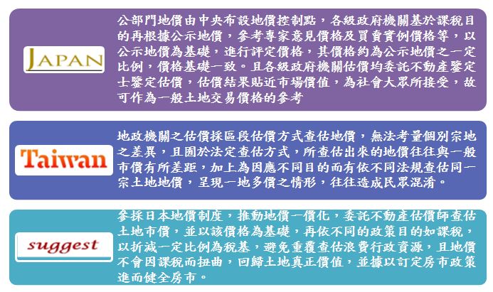 我國現行公部門地價查估係採區段地價方式,此種方式雖然可以估計大量宗地的價格,卻有忽略各宗地差異等缺失,而遭受外界詬病,故行政院於106年3月核定「地價查估技術精進與實價登錄資料應用發展計畫」中,參考日、韓地價制度及估價經驗,研究改進目前區段地價之缺點,期能提升地價查估之精準度,合理查估地價。