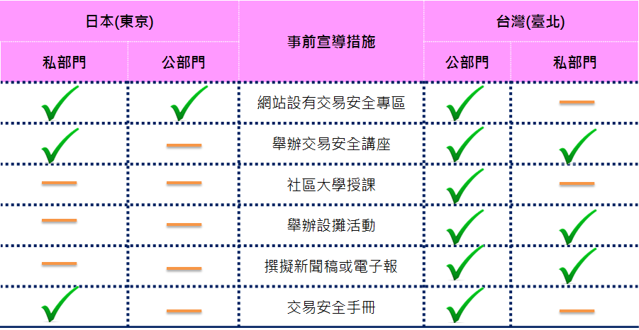 將維護交易安全之相關措施以交易流程分為事前宣導、事中查核及事後消費爭議處理探討日本與臺灣對於業者管理差異,發現日本與臺灣因應國情不同,事前宣導部分日本多由業者自行宣導,國內除業者自行宣導外,政府部門對於相關宣導作為著力甚深,臺日宣導機制比較整理如下表四。