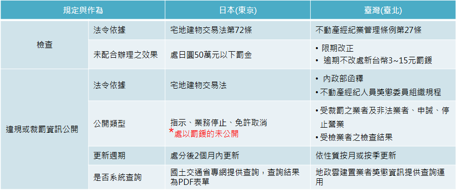 事中查核部分,兩國皆訂有查核業者機制及公開業者違規資訊機制,惟日本對於違規業者資訊採部分公開,而我國是採全面公開,兩國查核機制及相關資訊公開機制差異詳如下表五。