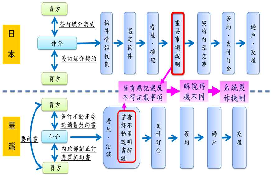 交易流程兩國差異點在於業者持不動產說明解說時機,日本係於看屋後,再以說明書向消費者解說,臺灣則是明定應於看屋時持說明書解說。此外,本局為輔導業者詳實製作不動產說明書,除規定不動產說明書應記載及不得記載事項外,更進一步開發不動產說明書製作系統,提供業者使用,同時讓市民了解說明書應有之內容,臺日不動產買賣流程差異整理如下圖一。