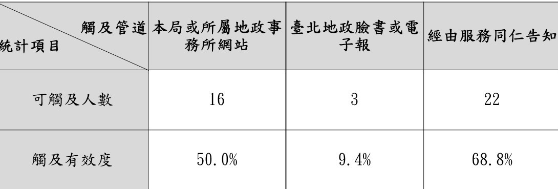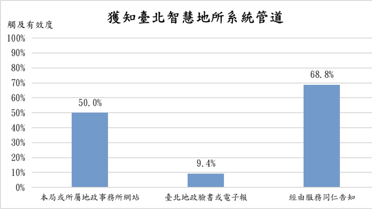 經由服務同仁告知本局已建置「臺北智慧地所系統」之觸及有效度為68.8%,經由本局及所屬地政事務所網站之觸及有效度為50%,另經由臺北地政臉書或電子報之觸及有效度為9.4%。