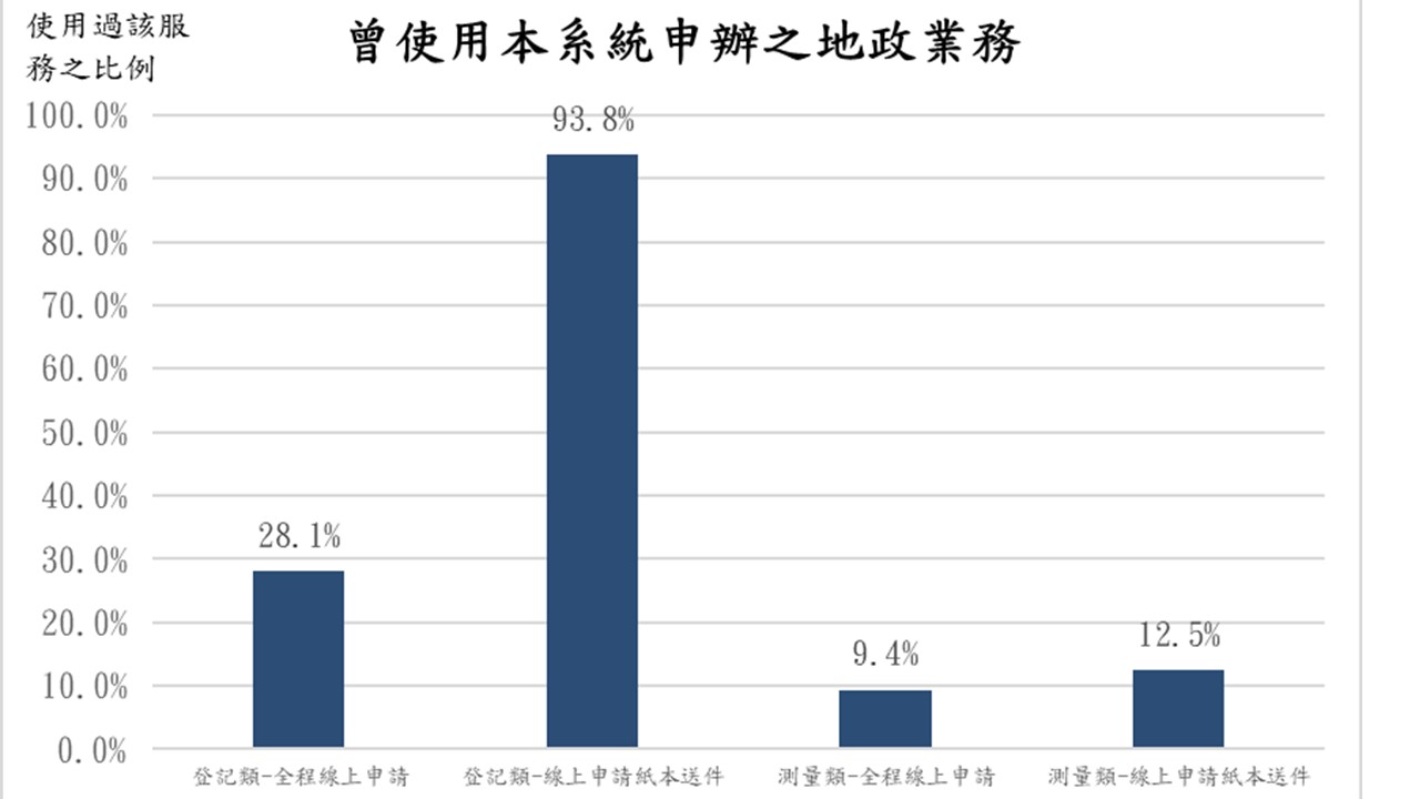 本次受訪者中有30人曾使用本系統辦理登記案件線上申請紙本送件;9人曾使用本系統全程線上申請登記案件;3人曾使用本系統全程線上申請測量案件;4人曾使用本系統辦理測量案件線上申請紙本送件。