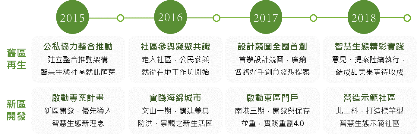 面對全球氣候變遷、城市競爭等內、外部挑戰與威脅,我們擬定「智慧生態示範社區」的施政目標,啟動公有土地活化利用,透過舊區再生與新區開發,運用兩大基金資源的挹注,邁向智慧與生態兼具的宜居永續臺北。