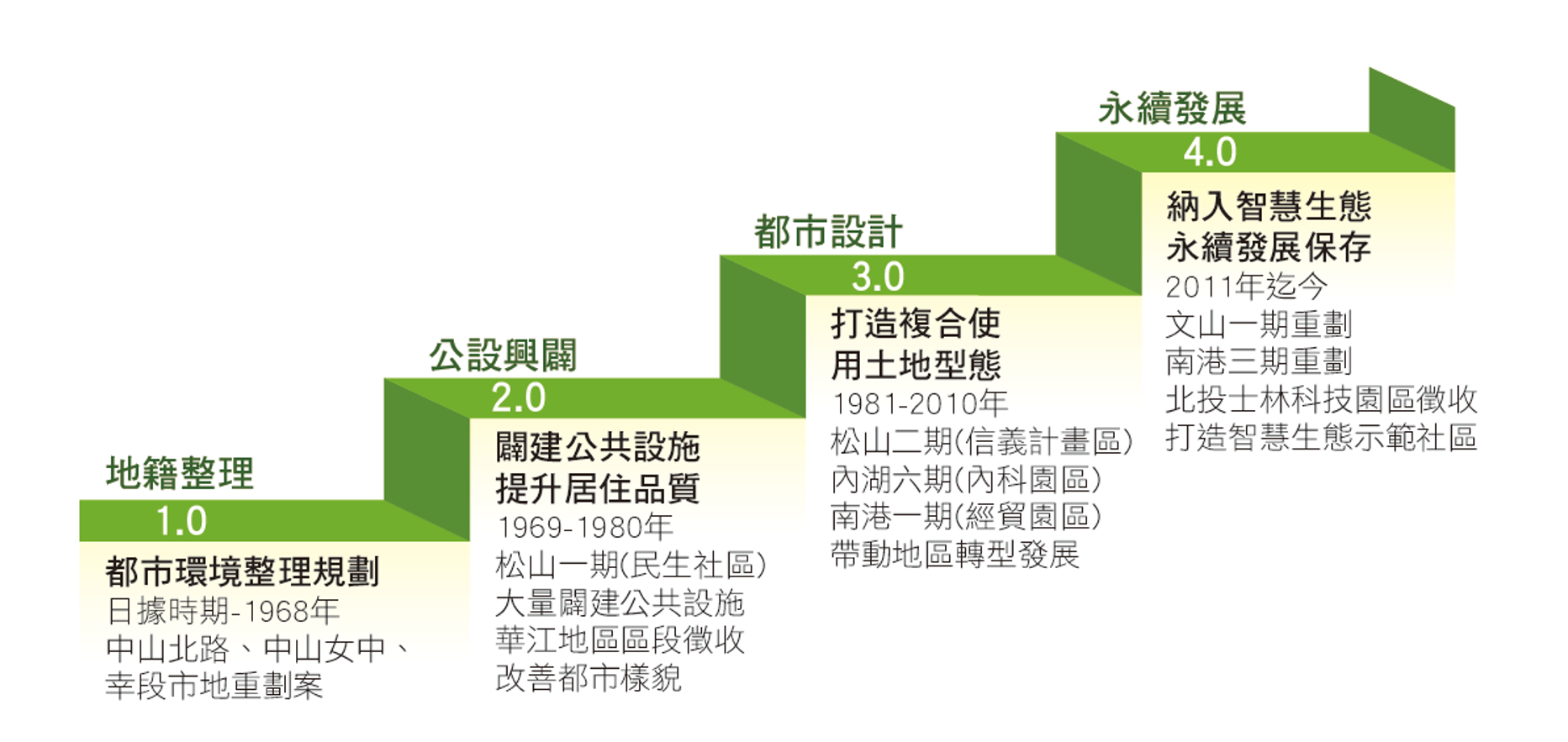 從早期「整體開發1.0」整理地籍,至1969年起進入「整體開發2.0」取得闢建大量公共設施,1981年後為「整體開發3.0」,導入複合使用的土地型態帶動地區轉型發展,2011年起邁向「整體開發4.0」,以發展與保存並重,打造智慧生態社區。