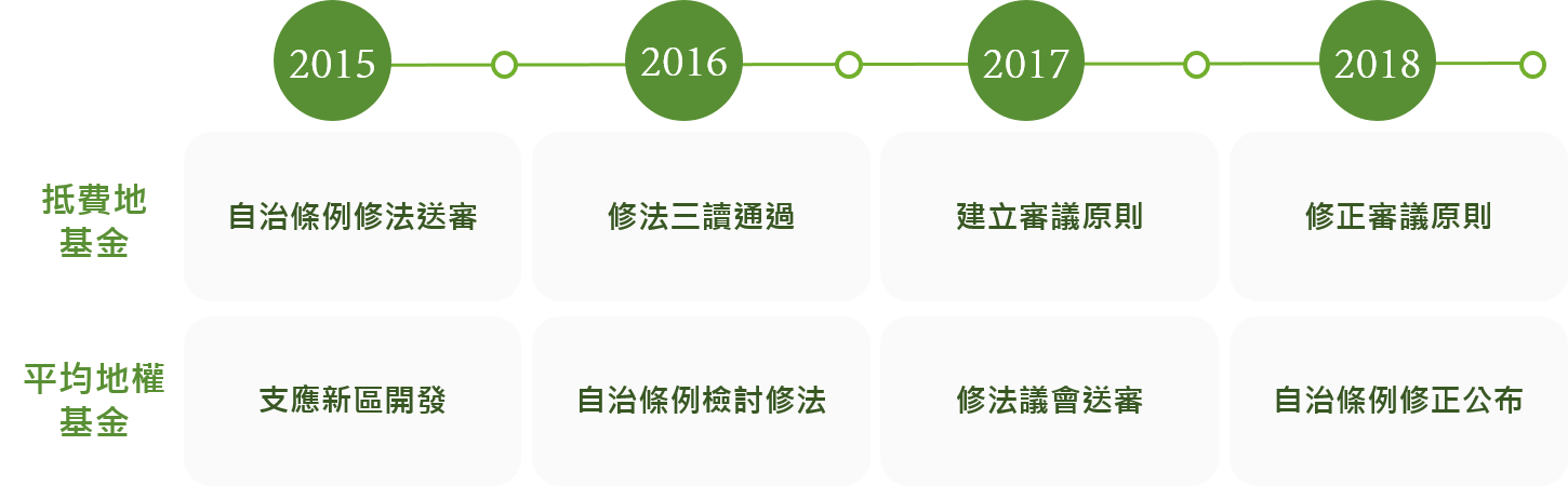 地政局經管兩大作業基金─「臺北市土地重劃抵費地出售盈餘款基金」、「臺北市實施平均地權基金」,是智慧生態社區的重要推手。四年來,我們持續針對兩大基金進行制度檢討與變革。透過建立重劃抵費地基金補助案件審議機制,納入公民參與、智慧生態等理念,加值公共設施服務水準。此外,提出修正「臺北市實施平均地權基金收支保管及運用自治條例」條文,透過法規修訂程序,將已辦竣整體開發區再發展之建設、維護、管理等費用納入支用範疇,有效持續推動智慧生態社區示範計畫。