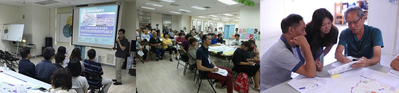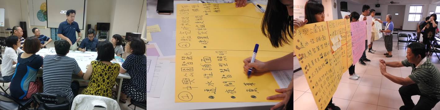 每場次工作坊視參與人數分為4到5桌,每桌安排1名具公民參與或社區營造經驗的專業桌長,及1名工作人員負責記錄,引導桌員交流討論及歸納意見。在討論前,每位桌員必須先自我介紹完成「破冰」儀式,再各自提出1至3個關心的在地議題,經由理解彼此,在桌長的引導下,每桌凝聚出3個具共識的共同關心議題及建議方案。經過80分鐘的討論後,各桌輪流上台以海報發表討論成果,並由所有參與者票選出當日最受關注的3項議題,最後由地政局與出席的權責機關進行綜合討論與回應(圖四)。