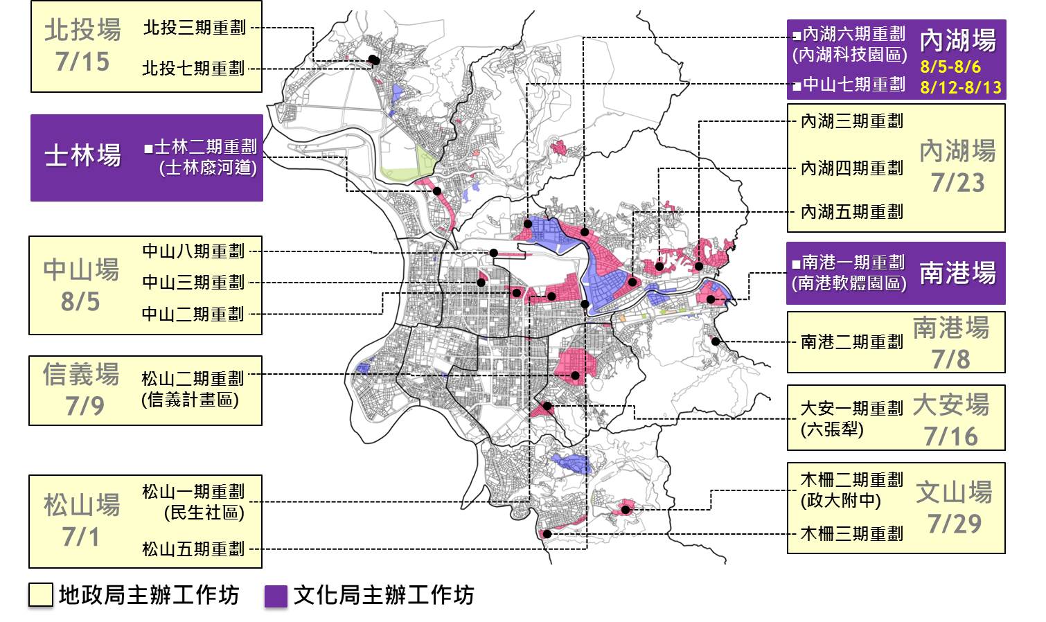 延續去(105)年5場在地工作坊的經驗與成果,地政局今(106)年與文化局、資訊局及社區大學等單位合作,於7月1日起至8月5日陸續於松山、南港、信義、北投、大安、內湖、文山及中山區共舉辦8場以上在地工作坊(圖一),透過不同身分、社群之意見交流與討論互動,凝聚在地需求與特色之共識,並藉此激發居民關心社區生活環境,延續在地文化,公私協力攜手共創宜居永續臺北。