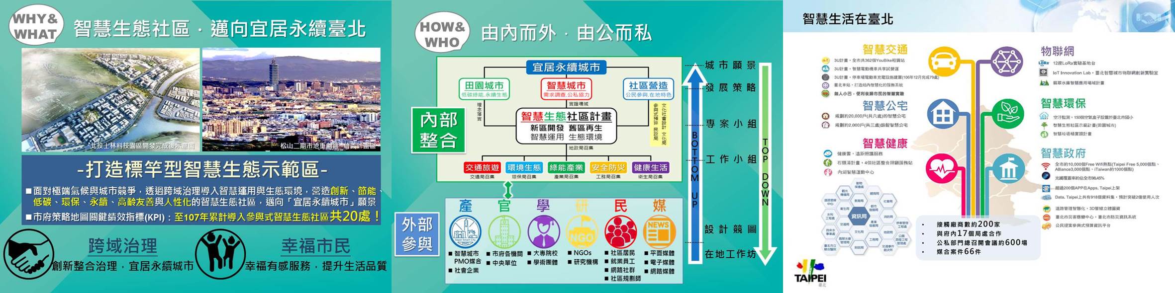 臺北市推動「智慧生態社區」,秉持「開放政府、全民參與」的施政理念,透過由上而下的願景規劃與由下而上的全民參與,於已開發完成超過10年、甚至30年以上的市地重劃區推動「舊區再生」,舉辦在地工作坊了解在地需求與特色,以改造區內公共設施及公有建築,提升公共服務效能,實現「民眾有感」的智慧生態示範社區!