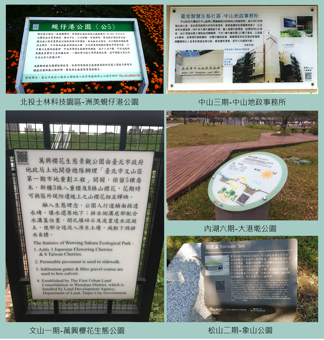 透過在地工作坊、設計競圖、可行性評估專案會議、協調會報等產、官、學、研、民、媒多方交流共議後,市府具體納入施政也讓民眾有感,我們於北投士林科技園區區段徵收、文山一期、南港三期、中山三期、松山一、二期市地重劃等9處推動地區現地設立了20面實體解說牌(圖1),包含試辦內科的智慧路燈;在學校、防災公園內建防災水井;在重要新開發區導入透水鋪面、雨水回收再利用、滲透井、生態草溝等皆建置完成,提供最智慧、最生態、最便利的服務給市民。漫步在臺北街頭或公園一隅,別忘了望望週邊環境,找找解說牌,掃掃QRcode,滑滑智慧生態設施介紹網頁。