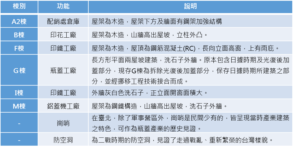 南港瓶蓋工廠位於南港第三期市地重劃區D區範圍內,依原都市計畫及重劃計畫書內容本將全區拆除,在公民團體陳情保留後,經過8次文資審議確定保留範圍(影片:為什麼南港瓶蓋工廠不能全區保留),再經公民團體、地主與市府多次溝通協調後,除了依文資審議保存8項地上物外,還增加保存屬非歷史建築之A1棟及G棟東側立面。G棟立面部分更採全國首創之工法,克服工程困難,挪移銜接至半拆之建物本體上,以維持瓶蓋工廠建築群的風貌及保存歷史紋理。