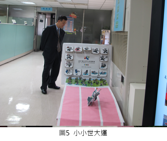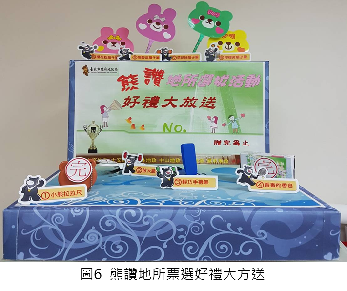 選拔熊讚地所活動計畫訂頒後,主任召集會議,在保持既有基礎下,另指定成立各項專案小組,由行政課成立友善環境小組、地籍資料課成立人氣推動小組、資訊課成立按個讚小組、登記課成立業績推動小組,小組成員包含各課室同仁,全面動員爭取獎項。各小組召開會議針對各指標擬定作戰活動,如行政課友善環境小組重新檢視環境設備逐一調整改善,且利用回收紙箱製作小小世大運(如圖5)推廣世大運;地籍資料課成立人氣推動小組拜訪里長尋求支持,出動古亭小棧行動辦公室至貓空宣傳,舉辦熊讚地所票選好禮大方送活動(如圖6);資訊課按個讚小組強力邀請親朋好友加入粉絲團,並增加宣導則數,好讓粉絲們按讚;登記課業績推動小組,積極推動重點服務項目績效。在各小組努力下,終讓我們榮獲熊蓋讚地所獎項。