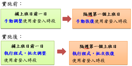 從各環節檢討行政作業有無需改善之處,並加以改造,得以提升機關行政效率;Mr.蜜舒得知中山地政事務所於資訊業務方面,積極推動自動化,改造現有作業模式,減少人力依賴,例如:建置地籍資料庫磁帶備份自動排程機制, 使用掃描程式輔助內部網路IP使用情形管理以及撰寫程式批次調整電腦登入時段設定(圖9)等,改變過往由人力逐一調整、設定及維護相關資訊業務,有效增加地籍資料登校人員彈性時間,得處理大量或緊急案件,提升機關行政效率。