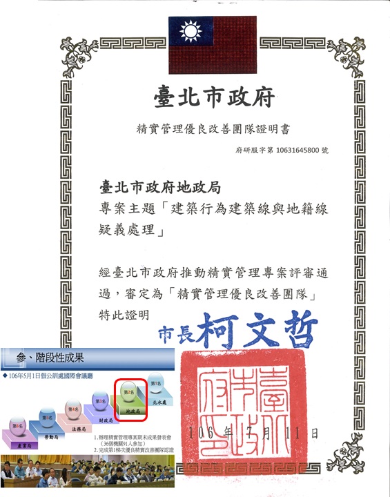 為加速地籍線與建築線檢測不一致之處理,避免因冗長之行政程序處理延宕民眾權益,針對跨機關處理地籍線與建築線疑義導入精實管理,透過精實管理讓「地籍線與建築線疑義處理減少了約45天」,並榮獲本府精實管理專案第二名。「實施者照過來 都更加速有撇步」使都更作業減少了約6個月,讓參與都更之民眾能更快回家。而今年地籍測量實施規則的修正,「屋簷雨遮產權測繪登記大變革」,自107年1月1日後取得建造執照之建物,屋簷雨遮將不再辦理測繪登記,不可不知。
