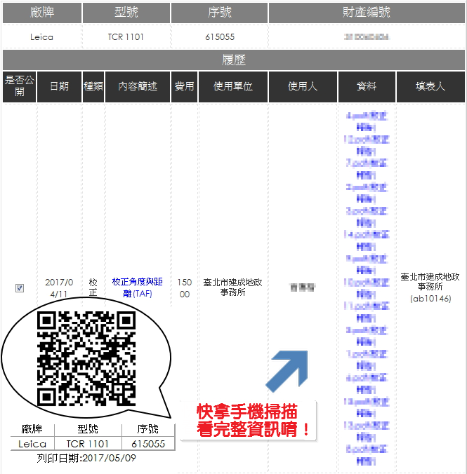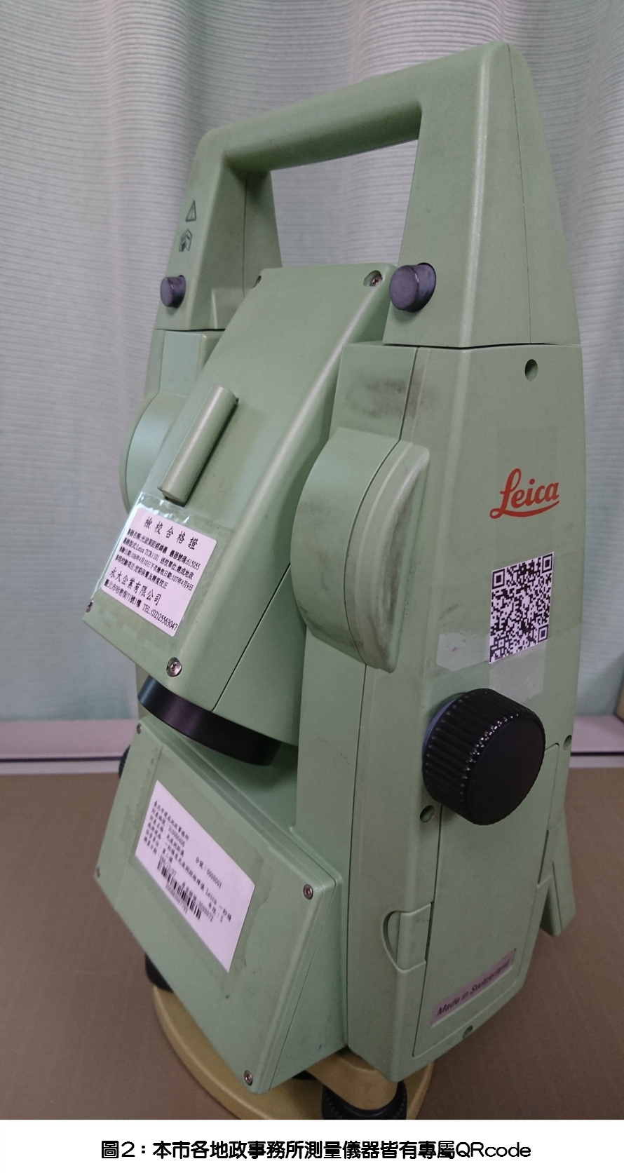農產品有產銷履歷,讓消費者買的放心、吃的安心,現在臺北市各地政事務所的測量儀器也有專屬的履歷囉!以往每臺儀器雖然有定期校正,但厚重的校正報告難以攜至測量現場供民眾參閱,僅能透過儀器上張貼「校正合格」字樣的貼紙來得知儀器辦理過校正,卻無法得知校正內容,但現在可以透過國土測繪中心「測量儀器履歷管理平臺」建置測量儀器電子履歷(見圖1),除可讓管理者便於管理及調配自有測量儀器,並可依各廠牌故障維修率,做為未來採購測量儀器之參考及可即時查詢儀器檢校資訊,以掌控所有儀器是否定期作維護、檢校、修繕及保養外,更可產製電子履歷條碼(QRcode),並將每臺儀器專屬QRcode黏貼在電子儀器上(見圖2),方便測量人員於外業測量時,免攜帶厚重的儀器定期維護、保養之相關資料,而是利用QRcode隨時供民眾查詢閱覽,不但更加便利,同時也提升受測者對測量成果之信心!