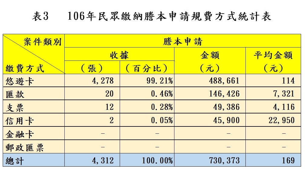 謄本申請非現金支付工具以悠遊卡約占99%使用率最高,使用悠遊卡繳納平均金額為114元、使用匯款繳納的平均金額為7,321元,使用信用卡繳納的平均則是22,950元,此與謄本申請平均應繳金額較低(每張為20元),正適合小額支付的悠遊卡有關,偶有大宗申請應繳金額較高才選擇使用匯款及信用卡方式(表3及圖2)。
