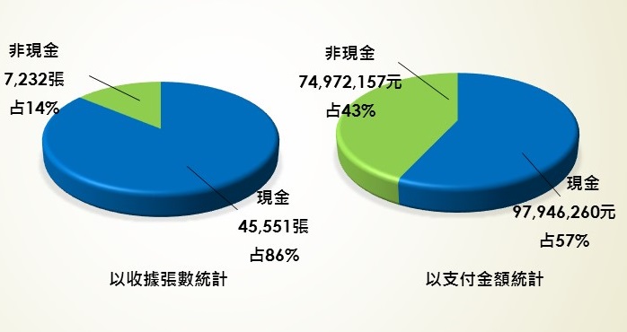 以支付工具統計的結果來看,使用現金者占86%,而以非現金支付者僅占14%;但若以支付金額統計,現金支付占總收金額的57%,非現金支付則占總收金額的43%,說明多數人仍習慣使用現金,但較大額的支出則以非現金支付工具為主要繳費方式(圖1)。