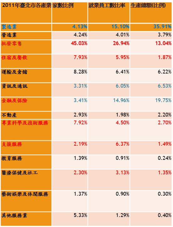 表3顯示2011年臺北市各產業別的發展情況,顯示以下訊息:(1)製造業之創新,屬於傳統製造業創新之比例是有多少?新興製造業興起之比例是有多少?尚待進一步解析。(2) 金融保險業尚未成為主領產業,也就是尚未成為臺北市成長最快、產值或所得最高、及創造提供最多就業機會的產業。(3)專業科學及技術服務逐漸興起。(4)批發零售產業呈現:規模小且家數多、就業人數多但產值所佔比例卻小。(5) 標紅色字產業之績效比不過藍色字的產業。