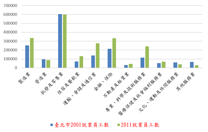 圖4. 臺北市2001及2011各產業就業員工數所佔比例變動(資料來源:行政院主計處工商服務業普查)