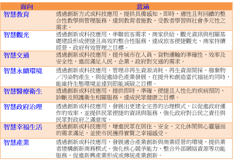 國內資訊工業策進會(2013) 也界定智慧城市的多元面向與其意涵,請參見表2。