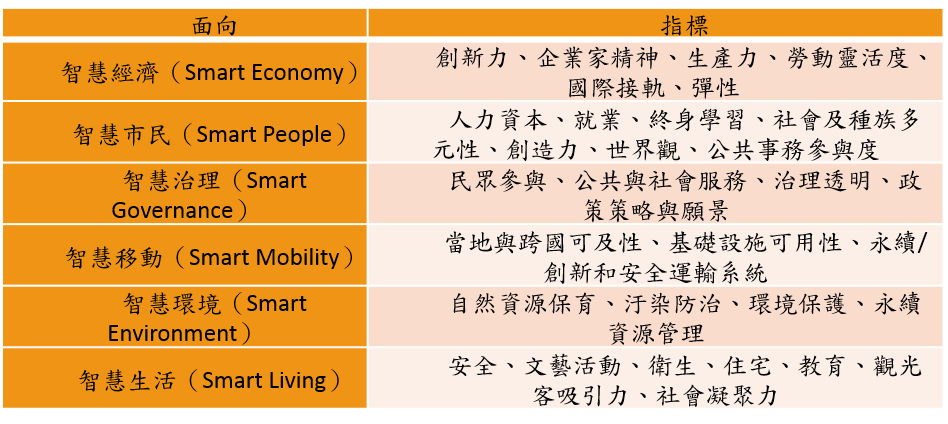 智慧城市(Smart City),即是充分運用資訊科技於城市的各行各業中,基於知識社會創新進行都市發展之精細化和動態管理。全球不少城市也開始努力進行智慧城市發展的計畫,例如,歐盟啟動了面向知識社會創新2.0的Living Lab計畫,致力於圍繞市民需求而努力,將城市建設成為各方共同參與的開放創新空間,維也納大學(2007)對城市體系評價的六個指標,即智慧經濟、智慧移動、智慧環境、智慧居民、智慧生活和智慧治理等六個方面。其意涵內容見表1所示: