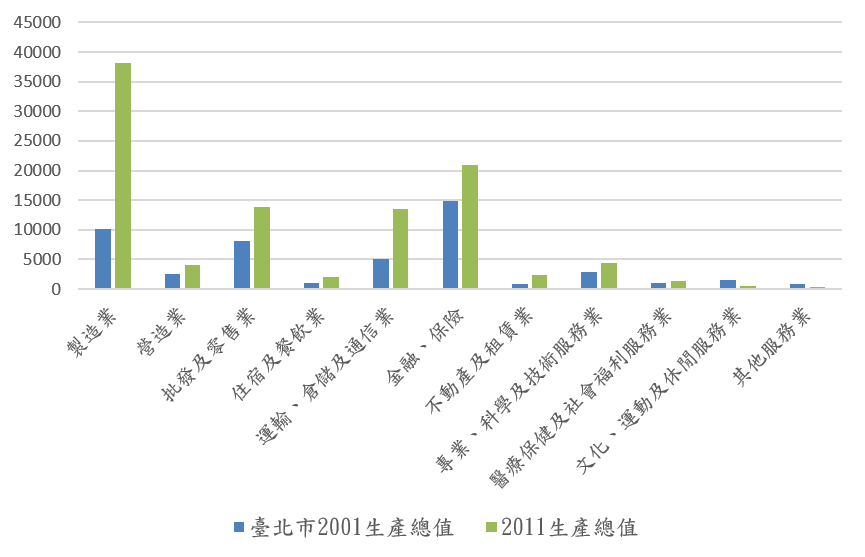進而分析臺北市内各產業歷年之變動情形發現:(1)製造業仍具優勢,統計數據顯示生產總值甚高,統計上係將於它縣市工廠或境外工廠所生產的產值計算於總公司(總管理處)所在地。(2) 金融保險業於臺北市內屬成長型產業。(3)批發及零售業佔用最多人(勞)力。(4)專業、科學及技術服務業快速成長,屬於新興之產業,也有所成長。詳見圖4及圖5之統計。