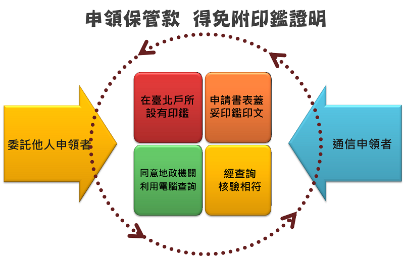 為了方便民眾申領徵收補償費保管款,地政局再推出得免附印鑑證明的便民服務,自即日起,民眾如需委託他人或通信申領保管款,只要已在臺北市各戶政事務所辦理印鑑登記者,得於申請書適當欄位註明「使用臺北市OO戶政事務所登記之印鑑,並同意地政機關利用電腦處理查詢」,該申請書及證明文件等所蓋用之印鑑印文經地政局以「數位印鑑比對系統」查詢並核驗相符者,得免附印鑑證明。