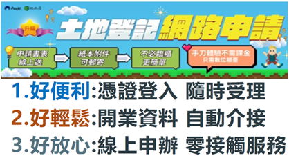 還在煩惱要親自至地政事務所送件申請土地登記案件嗎?還在擔心於機關間來回奔波辦理各項業務會有染疫之困擾呢?因應數位化、智慧科技發展潮流,現在除了臨櫃申辦地政業務外,亦提供線上申辦服務,由原須臨櫃申請辦理,簡化為24小時隨時隨地均可透過自然人憑證登入線上申辦系統,完成網路申辦,大幅降低過去排隊等候送件的時間及減少交通成本。
