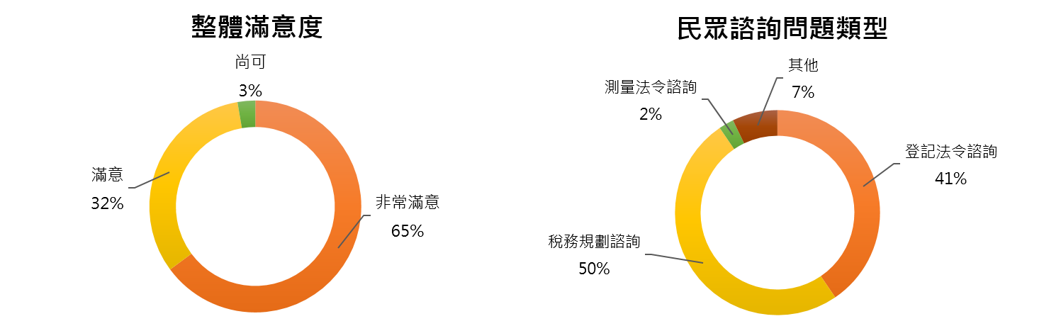 - 分眾辦理服務問卷調查:為使受服務民眾方便填寫問卷,除了提供紙本問卷外,同時提供線上問卷,另外亦會對提供服務之地政士辦理年度服務情形問卷調查。