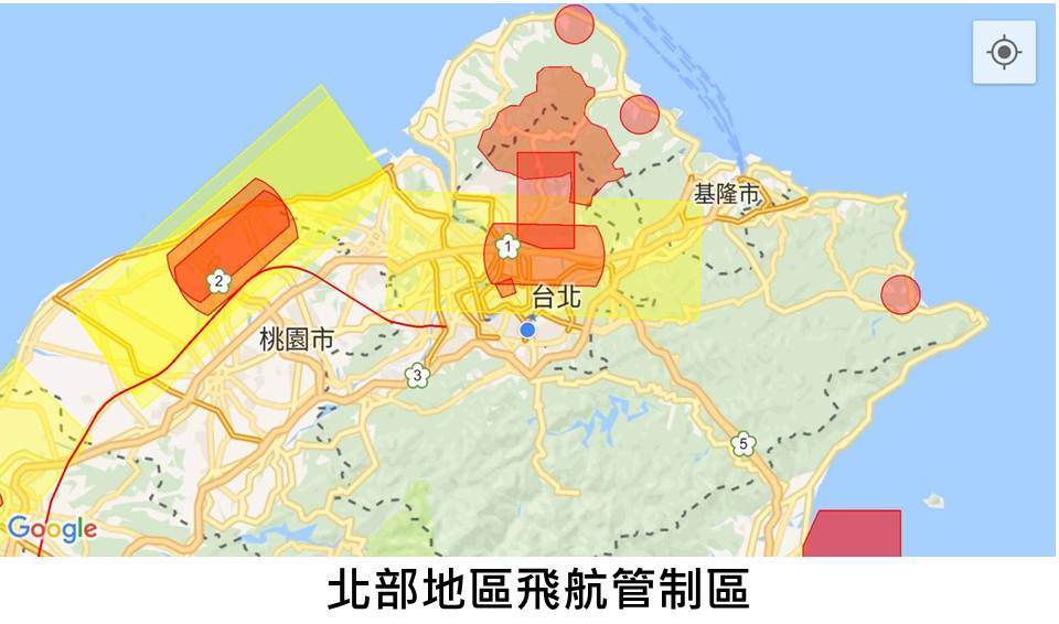 紅色區域為禁航區(禁止起飛),黃色區域為限航區(限飛高度60公尺),違反規定罰款相當重,30萬元起跳,已有多件罰款紀錄。實機操作