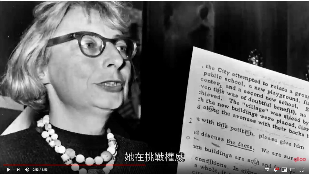 珍雅各(Jane Jacobs)一個被稱為家庭主婦作家,幾乎被鄙夷地稱作一個家庭主婦;這樣的一位女性,在這部電影裡面,我覺得她創造了一個非常巨大的貢獻是:只要一個市民願意發聲,願意為這個鄰里做一些他認為應該要做的事情,其實是有辦法匯聚成後來不可逆的巨大力量。