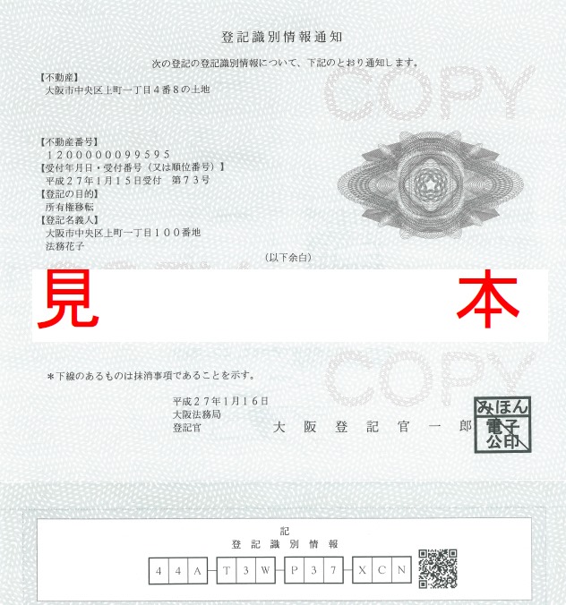 登記識別情報是用來取代以前的登記完成權利證,以資證明不動產所有權人產權的重要文件,於完成審查及登記程序後,由法務局發給不動產產權之權利人(圖4)。登記識別情報實際上是由英數字組合而成的12位數認證號碼,採紙本形式核發,並以不透明膠紙彌封數位認證號碼處。