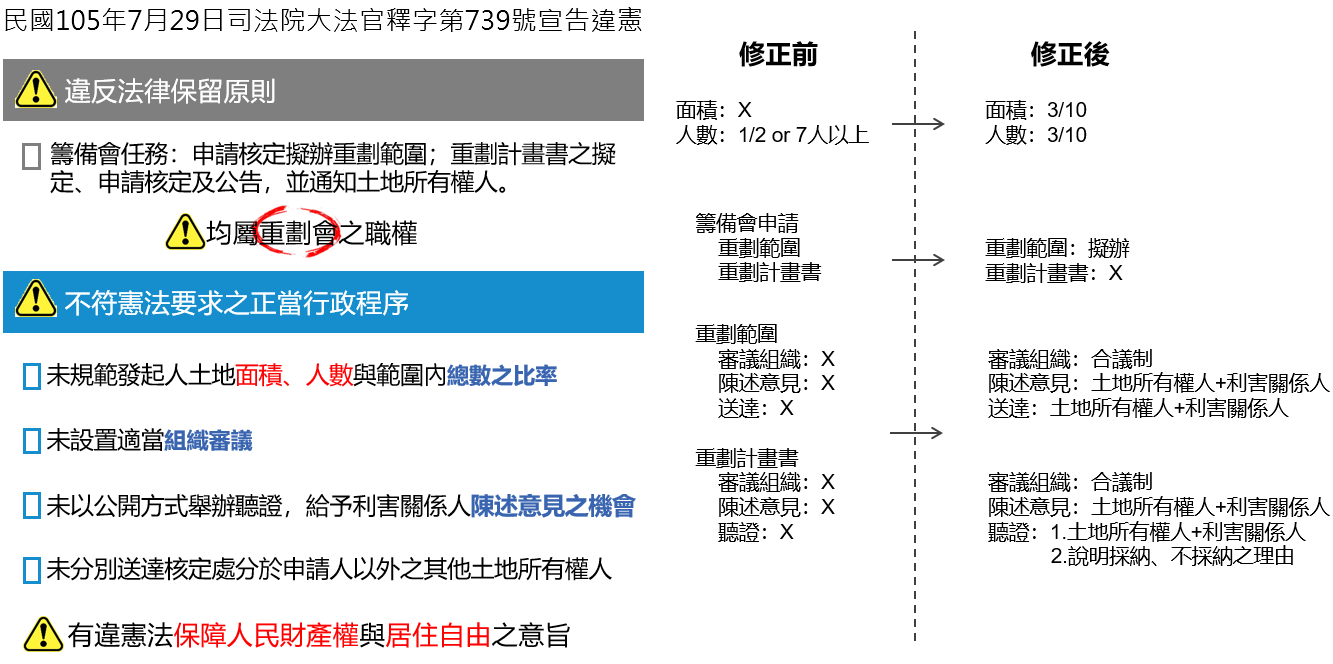 空格為因應司法院釋字第739號解釋宣告自辦市地重劃部分作業規定有違憲法保障人民財產權與居住自由之意旨,內政部於106、108年2次修正「獎勵土地所有權人辦理市地重劃辦法」(下稱獎勵辦法),限縮自辦市地重劃籌備會之權責、訂定成立自辦市地重劃籌備會之比率與主管機關任務等。