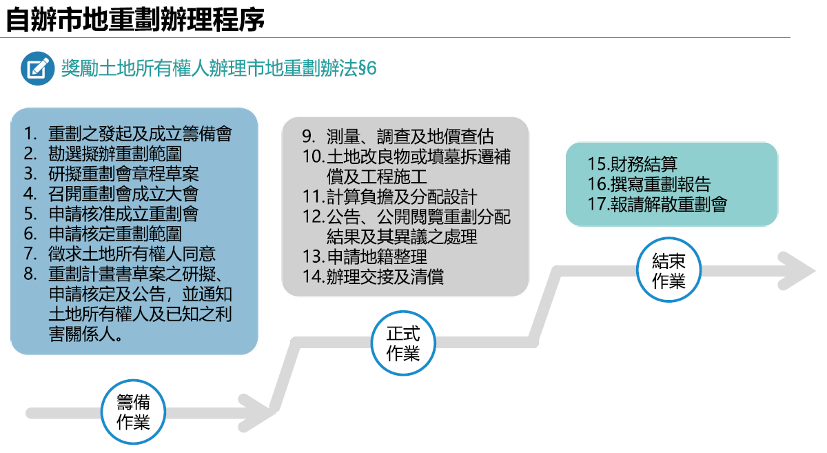 空格依獎勵辦法第6條規定,自辦市地重劃的主要程序有17項,可以劃分為籌備、正式及結束作業。