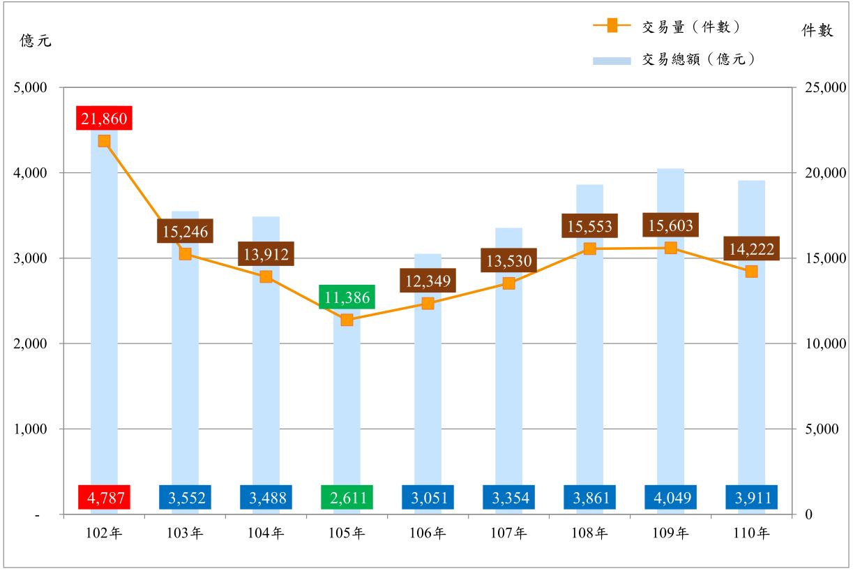 110年住宅交易件數為14,222件,較109年15,603件減少8.85%;交易總額為3,911億元,較109年4,049億元減少3.41%(圖1)。