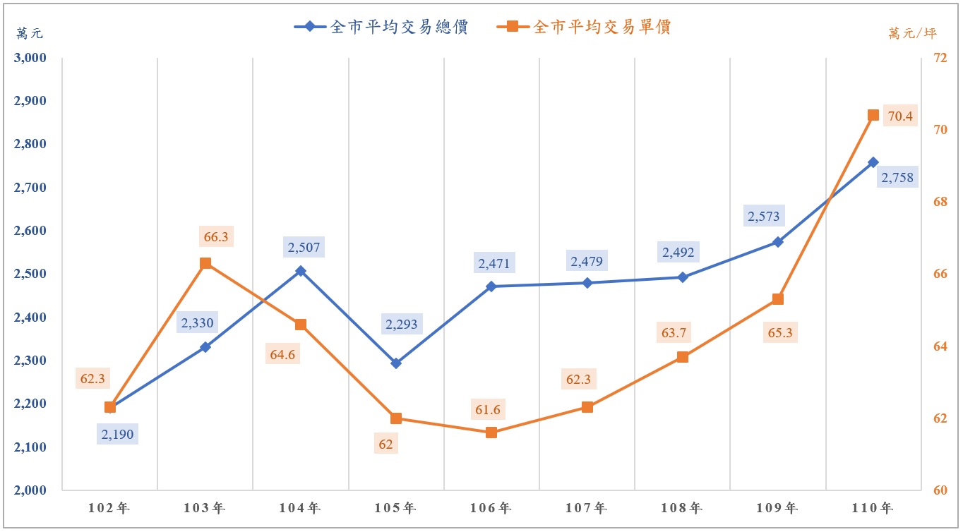 圖2 102至110年全市住宅平均交易總價及交易單價圖