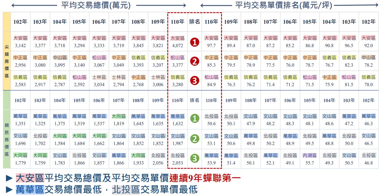 表1 102至110年各行政區平均交易總價、平均交易單價及排名