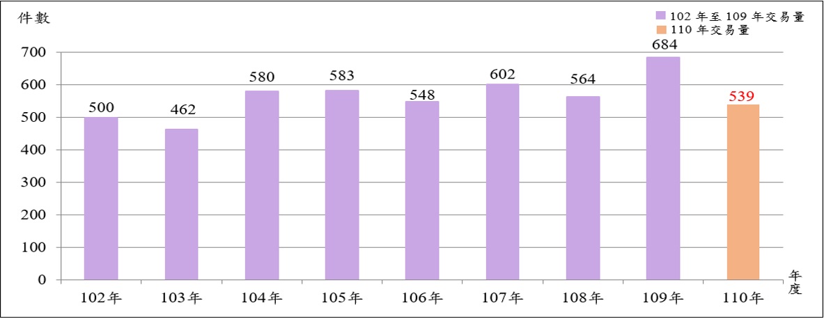 圖1 102至110年辦公市場租賃交易量圖