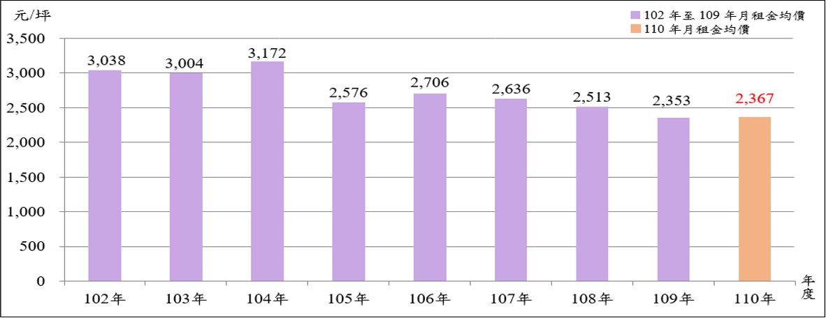 全市店面市場110年實價登錄租賃交易量539件,較109年減少21.20%,創近7年以來新低(圖4)。平均月租金單價2,367元/坪,較109年2,353元/坪上漲0.59%,但相較104年高點,下跌25.38%。102年至110年平均月租金,最高為104年3,172元/坪,最低為109年2,353元/坪(圖5)。