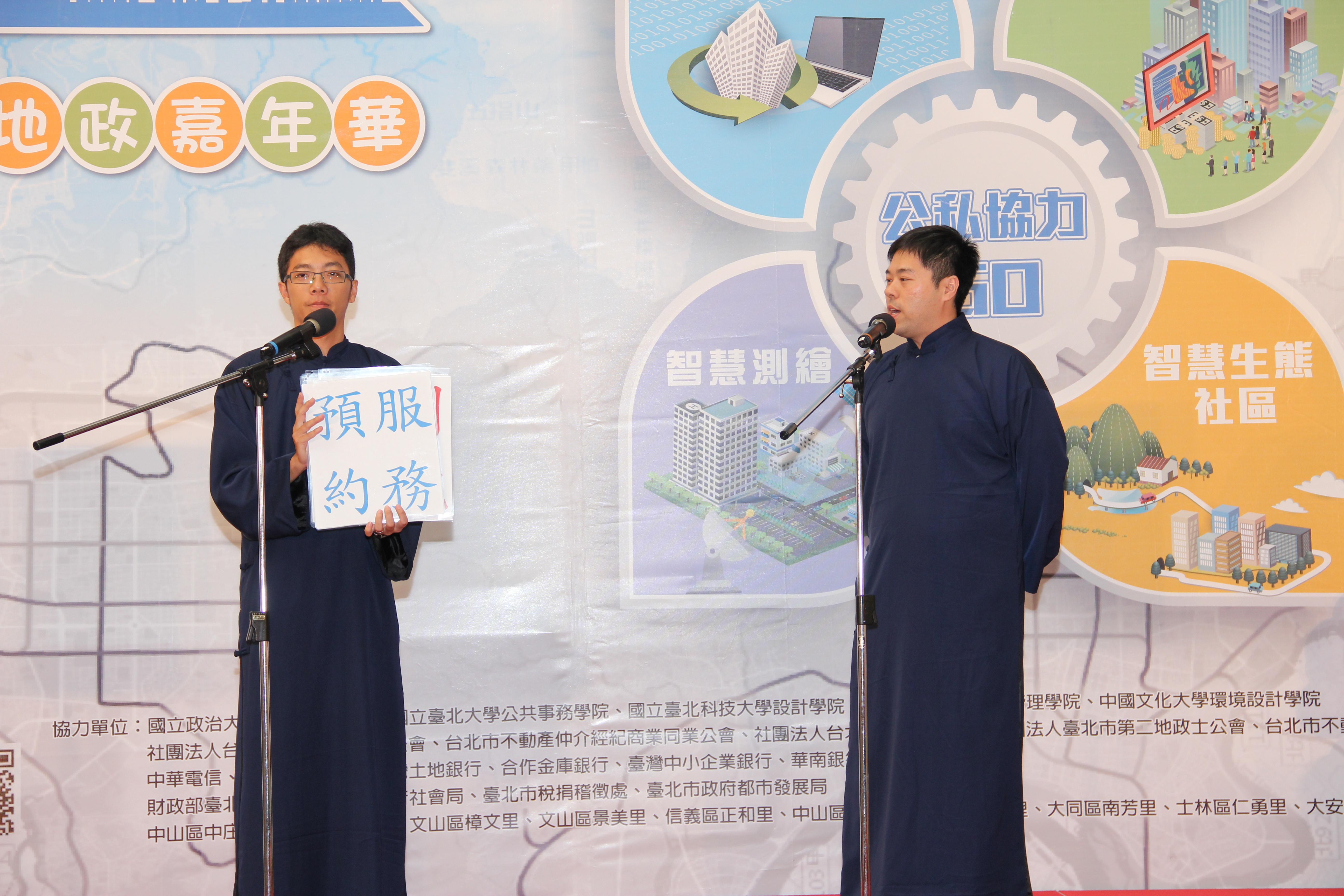 本局為呈現推行公私協力及跨域跨界成果,於105年11月21、22日於臺北市政府市政大樓1樓中庭,舉辦「臺北地政嘉年華~公私協力 GO」活動。首日活動以五校五公會簽約及社區不動產諮詢開辦儀式打頭陣,現場並設攤位提供地政業務介紹、貼心諮詢服務、相聲表演及闖關送獎品等活動。