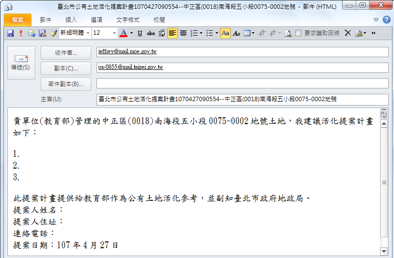 圖二:公地活化提案平台提案畫面(以Outlook開啟)