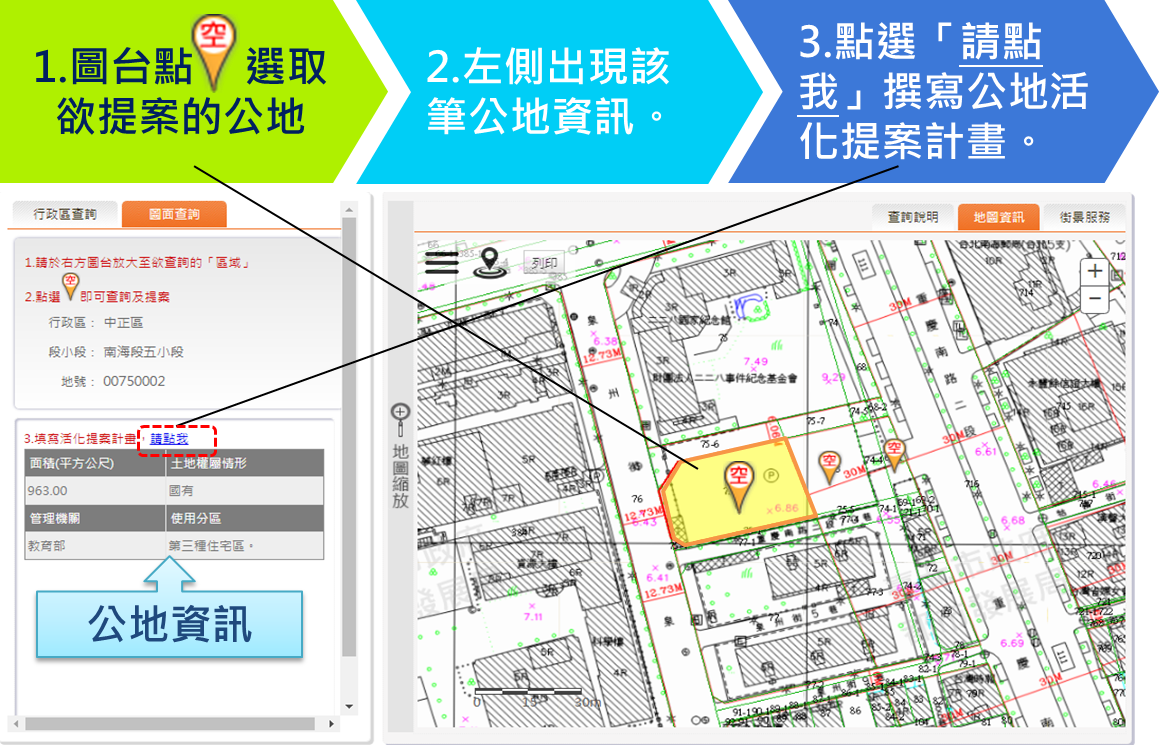 另一方面,民眾如對臺北市市有房地活化提案,臺北地政雲/公有土地項下已設置「市有閒置空間查詢平台」,點選後將連結至由臺北市政府財政局維護管理的「臺北市市有閒置空間整合查詢平台」,提供市有閒置空間的提案活化管道。