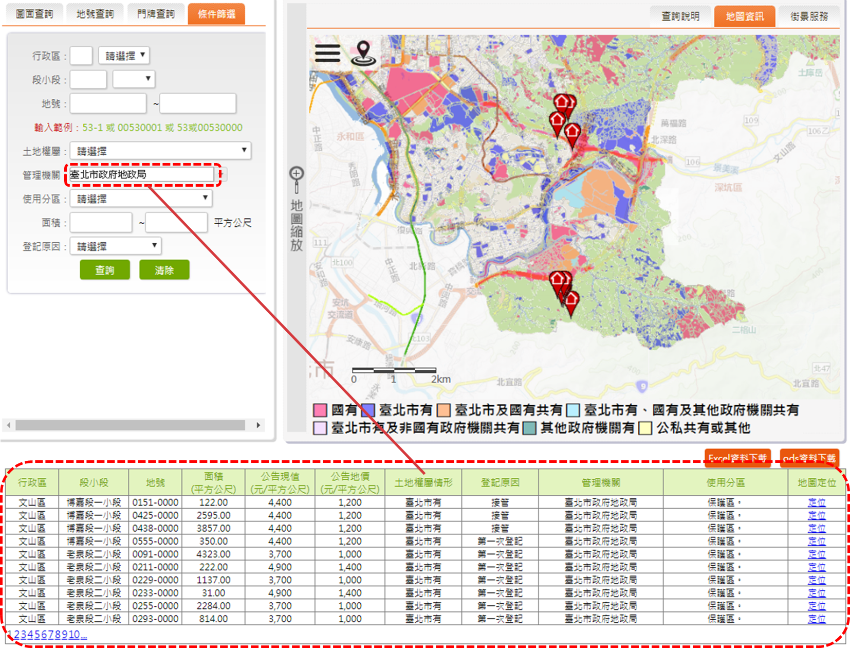 臺北地政雲/公有土地/公地查詢,新增「條件篩選」功能,使用者可依自己的需求,以行政區、土地權屬、管理機關、使用分區、登記原因或是輸入土地面積範圍等條件,篩選特定的公有土地資料,例如點選清單(或自行輸入)臺北市政府地政局管理,所有該局管理的公有土地資料,將以清單表列於圖台下方(圖四),清單表列土地位置也會同時標記在圖面上,方便使用者對照查詢。
