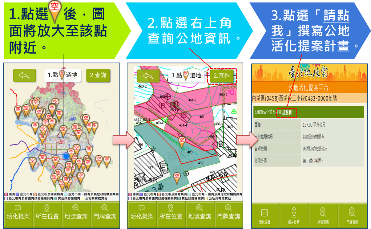 臺北地政雲「非市有公地活化提案平台」、公地查詢「條件篩選」以及「市有閒置空間查詢平台」等新功能,可降低民眾參與障礙,為提供使用者更便利的操作介面,地政局已著手規劃優化公地活化提案平台,包括查詢功能調整、全市圖幅調整、查詢結果之圖台定位調整及點選圖台回傳資料顯示方式等,並將可供活化提案公地資料整理製作成shapefile檔,上傳至臺北市政府資訊開放平台,提供下載應用。相關作業預計於107年6月初完成,期待透過全民參與,共同活化公有土地利用,改造城市風貌,提昇生活品質及城市競爭力。歡迎各界多加利用。