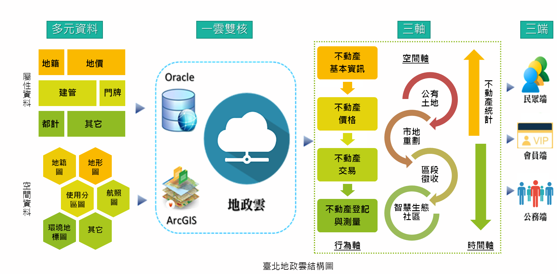 「科技始終來自於人性」詮釋了使用者導向的重要性,「臺北地政雲」特別針對「三端」民眾端、會員端、公務端等不同族群,規劃設計專屬的功能及介面,從使用者出發設計以「三軸」為架構,一是「行為軸」指從民眾「查房地:不動產基本資料」→「比價格:不動產價格」→「尋交易:不動產交易」到「辦登記:不動產登記及測量」,這個順序即為民眾搜尋買賣不動產所需相關資訊的程序;二是「空間軸」包含公有土地、區段徵收、市地重劃、智慧生態社區等區塊資訊;三是「時間軸」則針對平台資料,提供視覺化時間序列之統計比較查詢(如下圖)。
