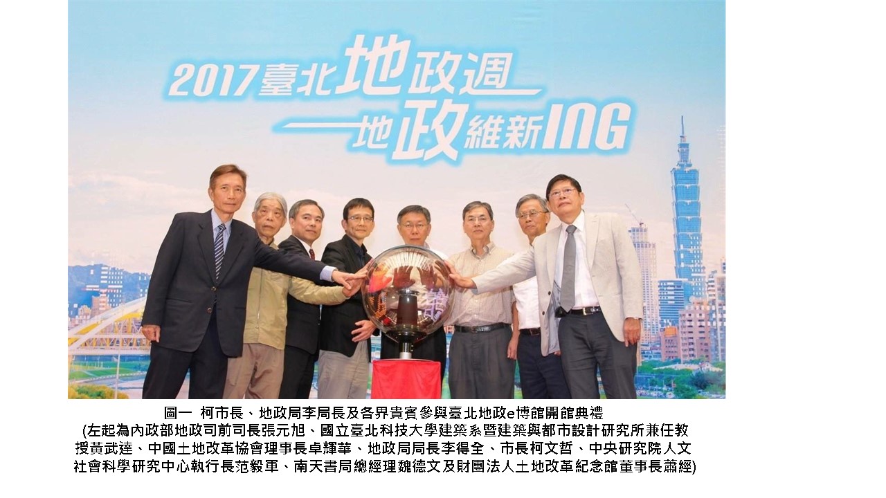 本局特於「2017臺北地政週系列活動」,邀請柯市長及內政部地政司前司長張元旭、國立臺北科技大學建築系暨建築與都市設計研究所兼任教授黃武達、中國土地改革協會理事長卓輝華、中央研究院人文社會科學研究中心執行長范毅軍、南天書局總經理魏德文及財團法人土地改革紀念館董事長蕭經於11月7日共同啟動臺北地政e博館開館典禮,同時也頒發感謝狀給協助e博館建置及配合參展的貴賓。