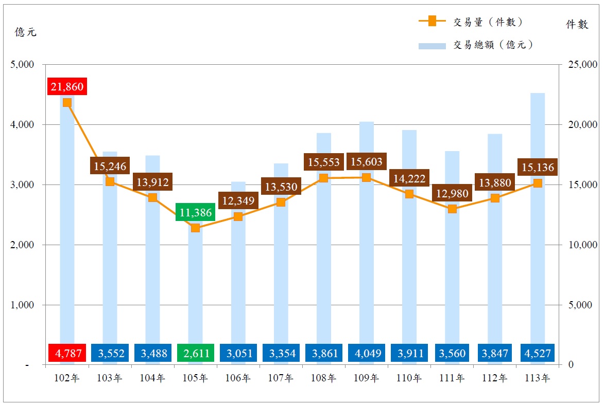 113年住宅交易件數為15,136件,較112年增加9.05%;交易總額為4,527億元,較112年增加17.68%,交易量及交易總額皆較112年增加(圖1)。