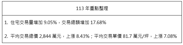 經整理分析113年資訊,彙整如下表,希藉由重點的歸納,一張表掌握113年臺北市住宅市場交易脈絡。
